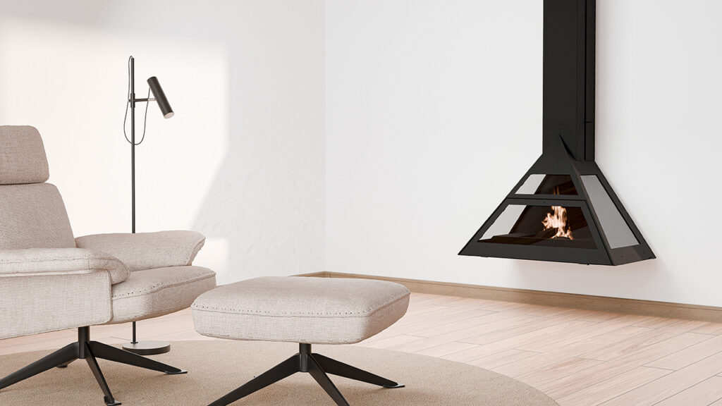 Xemeneia moderna amb panoràmica del foc frontal de gran amplitud, construïda amb estructura metàl·lica i que permet múltiples solucions de col·locació: a la paret o sobre base especial. Una opció versàtil per a qualsevol espai.