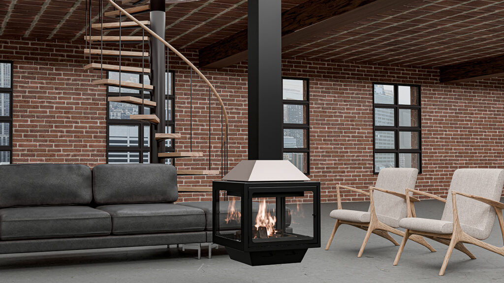 Xemeneia de disseny cúbic suspesa al centre de l’espai, fabricada en metall i amb opció de personalització de color a la part superior. Una peça contemporània per a interiors amb personalitat.