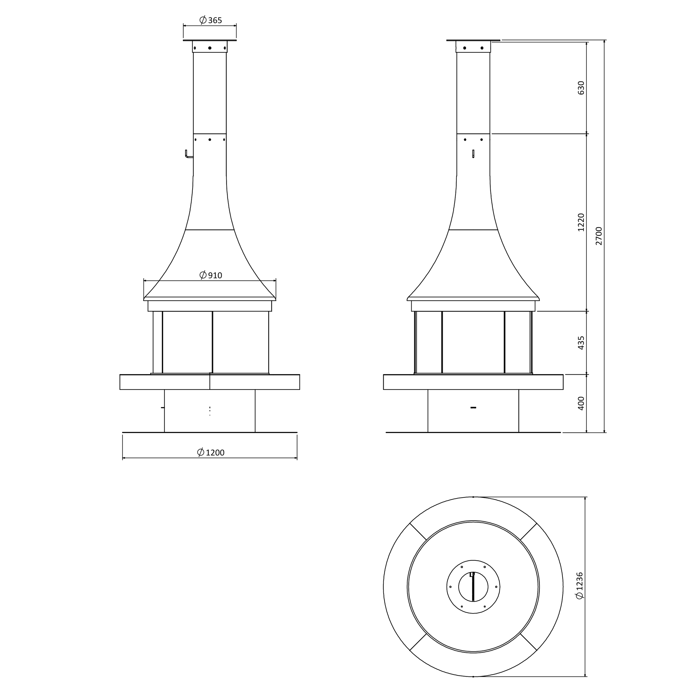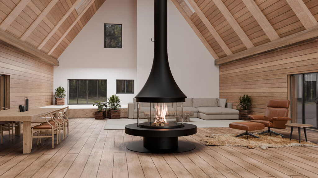 Xemeneia central de disseny amb estructura metàl·lica i visió panoràmica de la flama a 360º, amb vidres circulars que envolten la base. Concebuda com un element escultòric capaç de transformar qualsevol espai arquitectònic.