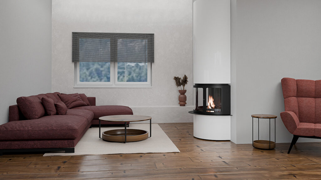 Xemeneia frontal amb estructura metàl·lica, tancament hermètic i gran visió del foc, que combina seguretat i estètica. Amb la possibilitat de personalitzar-la per crear una peça única.
