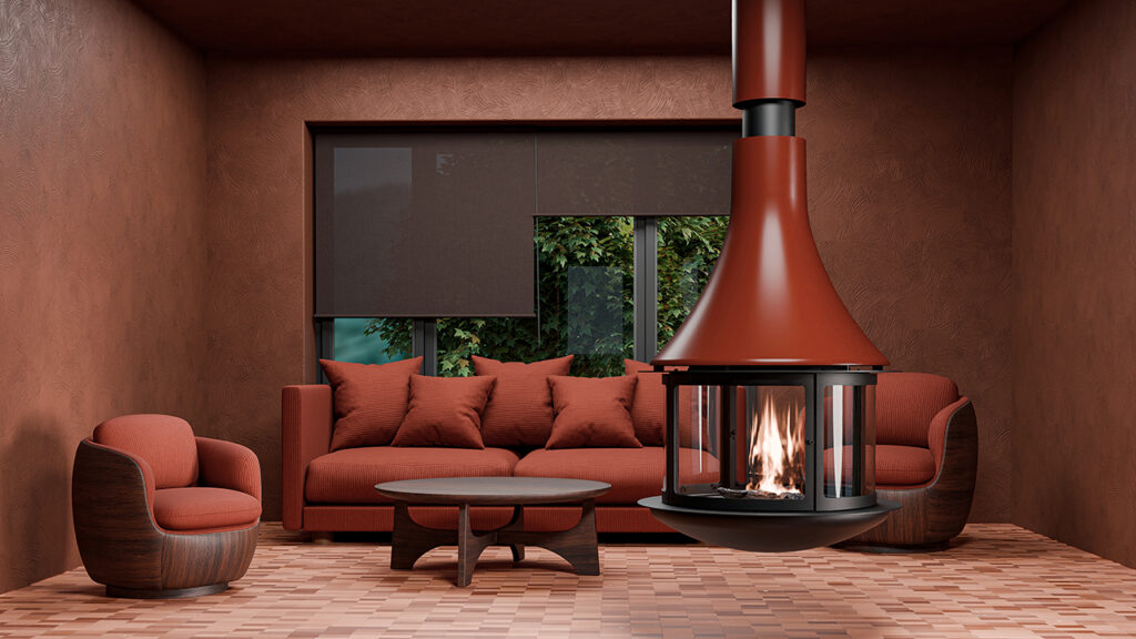 Redefineix els interiors amb aquesta xemeneia central i suspesa de disseny. Estructura metàl·lica, campana doble (opció de color) i personalitzable, amb visió del foc de 360º, creant un element central de gran impacte visual.