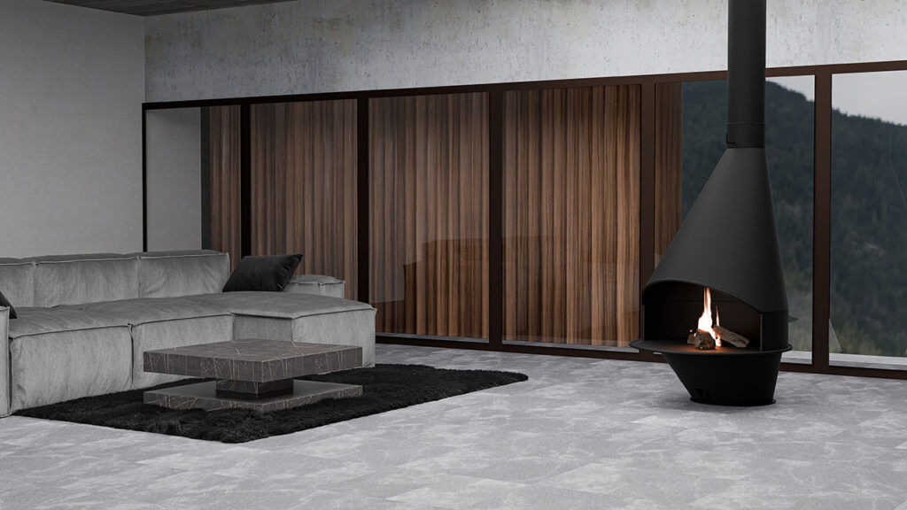 Xemeneia de disseny amb foc obert, estructura metàl·lica i formes geomètriques. La seva obertura gran permet gaudir d’una visió completa del foc, aportant estil i presència a qualsevol interior.