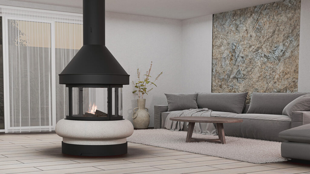 Xemeneia central de gran presència que uneix metall i pedra natural, oferint una elegància atemporal i un impacte visual immediat. Dissenyada per transformar qualsevol espai en un lloc acollidor i amb caràcter.