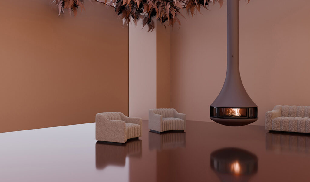 Xemeneia de disseny suspesa amb estructura metàl·lica i formes orgàniques, tancament hermètic i gran eficiència. Ideal per interiors moderns, aporta estil, presència i impacte en qualsevol projecte.