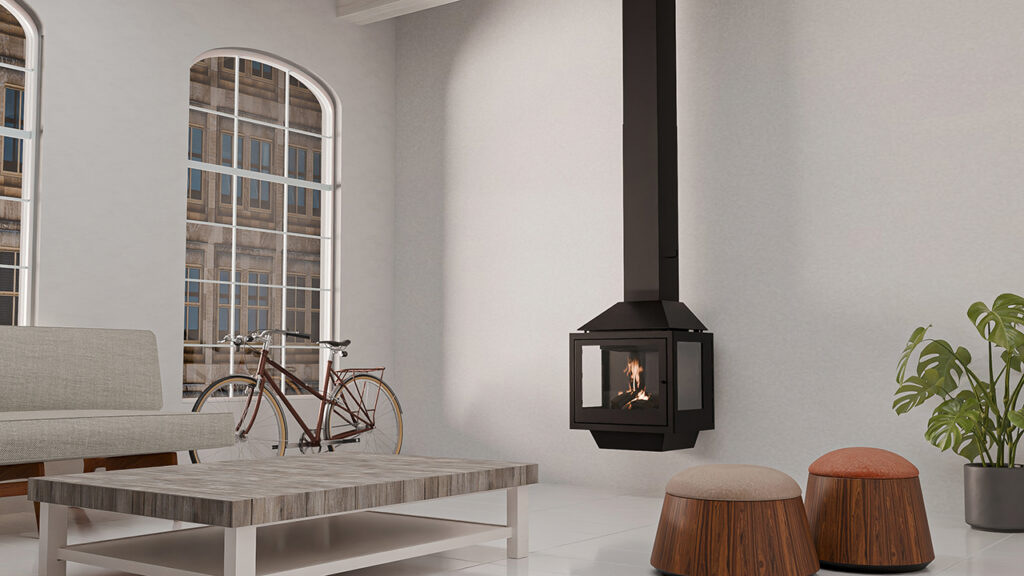 Designer fireplace with frontal view of the fire, metal structure, and colour-customisable top, ideal for stylish and characterful interiors.