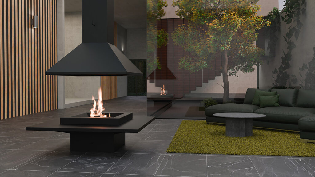 Transforma cualquier espacio con esta chimenea central abierta de metal atemporal, un diseño impactante cuyas dimensiones ofrecen un auténtico espectáculo del fuego, lleno de calidez y personalidad.