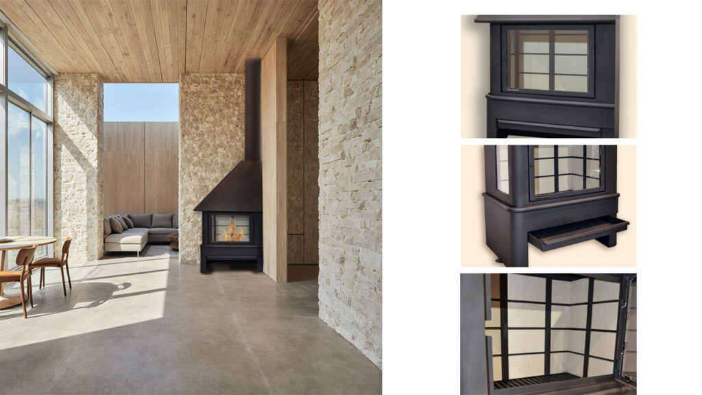 Cheminée conçue pour s’installer dans les angles, optimisant l’espace disponible. Elle offre une large vue sur le feu, créant une atmosphère chaleureuse et accueillante, et son design polyvalent s’adapte à tous les intérieurs.