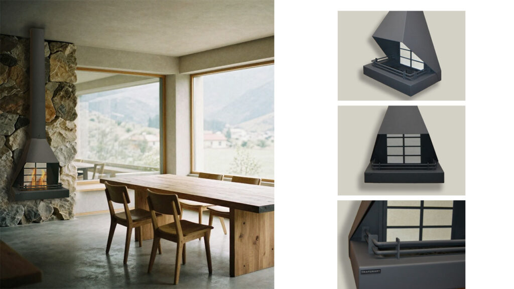 Cheminée ouverte au design polyvalent, qui s’intègre avec élégance dans tous les espaces, apportant chaleur et caractère à l’ambiance.